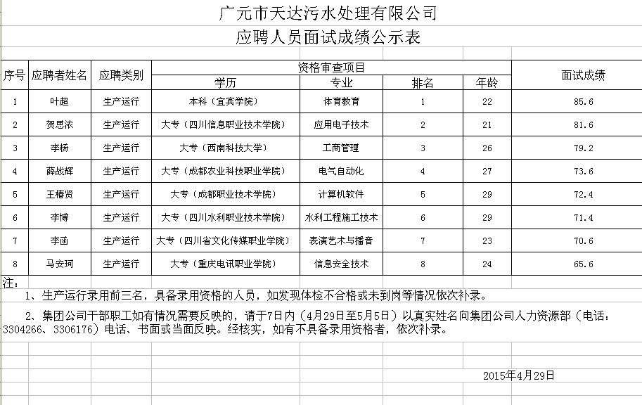 廣元市天達污水處理有限公司應聘人員面試成績公示表
